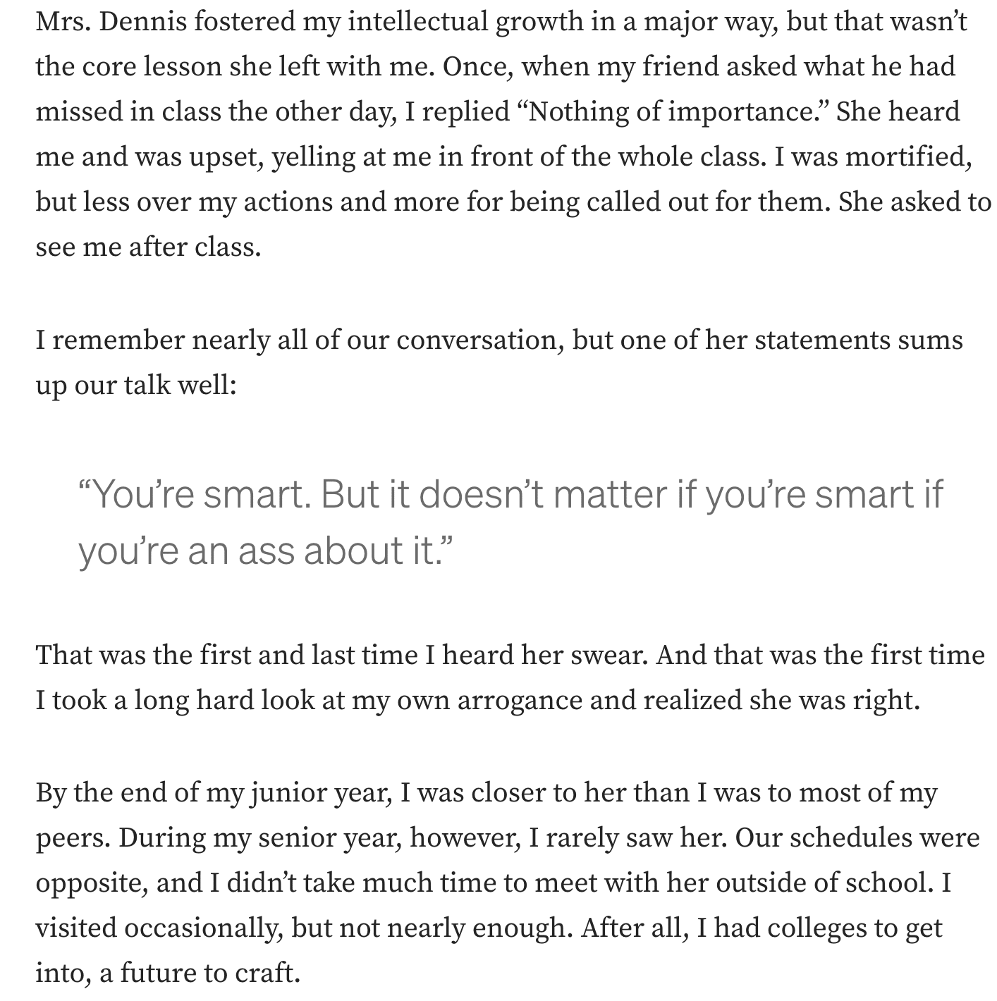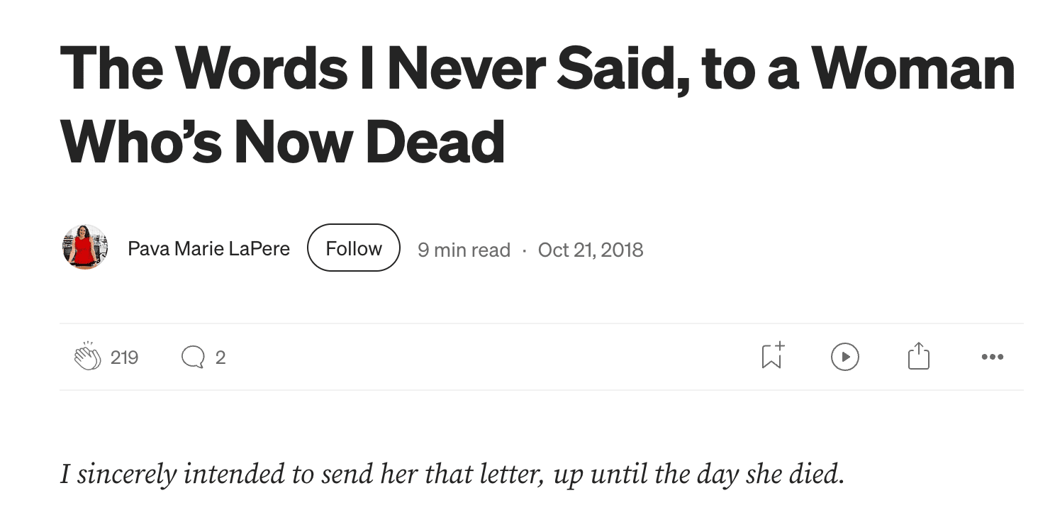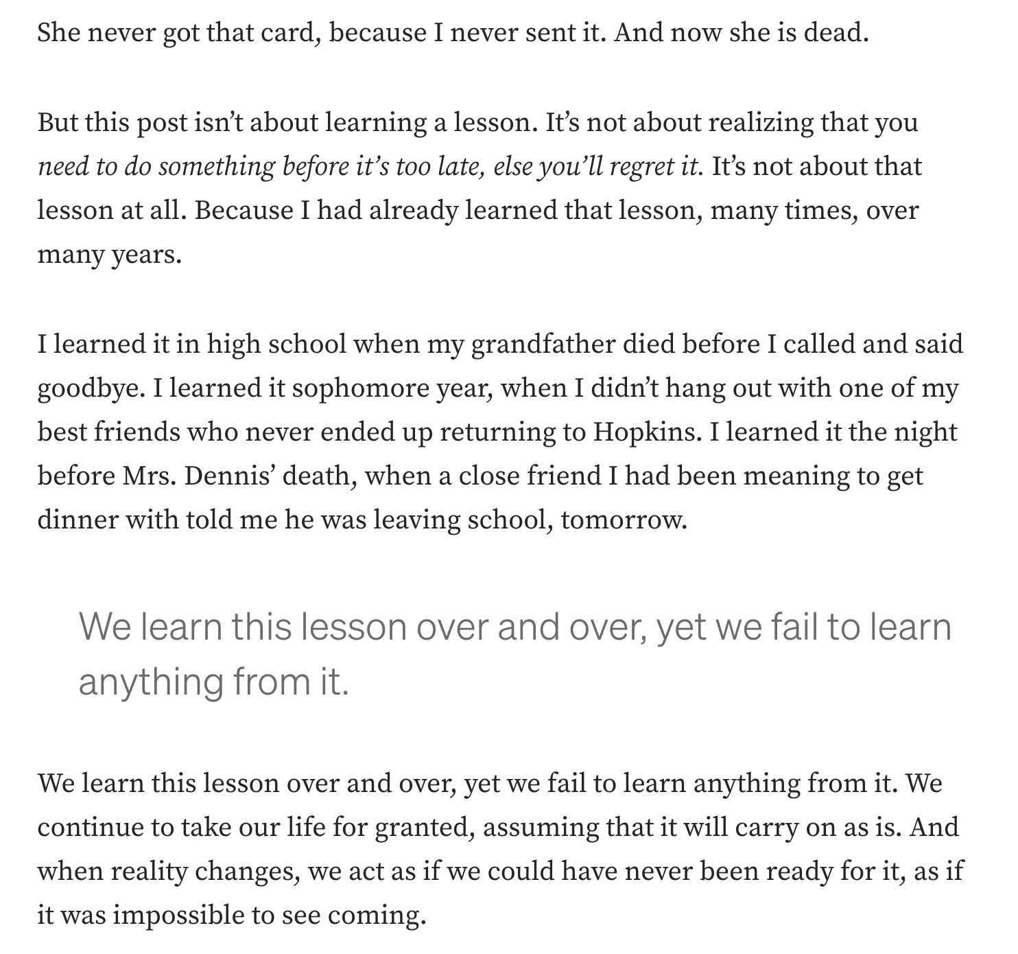 When you read the title of this newsletter, did you think it was referring to me and Pava?Well it is. Sorta. They are in fact Pava's words. And in many ways, Forget About Your Life Plan could be summarized with this title. But in this instance, Pava wrote them about a woman who is also no longer with us: Mrs. Dennis. So who is Mrs. Dennis? I only have some idea. Pava penned a Medium post titled The Words I Never Said, to a Woman Who's Now Dead on October 21st, 2018 - a couple of days after Mrs. Dennis passed away after losing a long battle with cancer (or as the late, great Norm McDonald would call it, a draw. Miss that old chunk of coal.) First, I encourage everyone to read Pava's post on Medium for the rest of this post to make any sense. I first read Pava’s post, The Words I Never Said, to a Woman Who’s Now Dead, a couple of weeks after she was now dead. An EcoMap colleague posted the blog in our company’s newly-created #memories-of-pava Slack channel, which was populated with photos, memories, and classic Pav-isms (”Are there any questions, comments, concerns, and/or life grievances?” signaled the conclusion of every meeting). Reading the Medium post felt like discovering an “old new” song by your favorite musical artist. You thought you had heard their entire discography, but an obscure self-published track lurked under the radar for years, only resurfacing because that artist would never create a new tune again. Despite the joy of discovery, there’s always the danger of that song not living up to the expectations you have of it. Maybe there was a reason that song persisted in obscurity. This post was a certified Pava LaPere classic. It fully displayed her emotional vulnerability, intellectualized empathy, and self-aware genius. Her writing was raw yet filtered. The piece contained the same unmistakable wit that permeated all of her writing, speeches, lectures, and casual conversations. And it concluded with a classic Pav-ism: the point is that there isn’t any. Or at least not the point that you thought was coming. A thing happened that matters, but just because it matters, it doesn’t mean anything will necessarily change. It’s up to us to make what happened matter. -- Pava and I had never talked about Mrs. Dennis before, but after a 9 minute Medium read, I felt like I could tell exactly the type of teacher she was and the impact she made on Pava. Some of us are lucky enough to have a Mrs. Dennis as a guiding light in the haze of high school. My Mrs. Dennis was Mrs. Flinn. I started to think about how I would react if such a formative figure in my life was diagnosed with cancer. Would I have the courage to knock on Mrs. Flinn’s door, to send that letter? And if I did, would I be able to convey anything of substance or would it be full of cliches and platitudes? After finishing that Medium post, I felt a familiar sensation of being captivated by Pava. Over the years, I’ve had a front row view to some of her most miraculous feats. As her serial partner in crime, I witnessed her be the driving force behind developing multiple programs from scratch that would go on to serve hundreds of student entrepreneurs and local small businesses. As her colleague, I observed her convince men twice her age that she was deserving of their trust and millions of dollars. And as her roommate, I watched her burn the midnight oil as she grew EcoMap from a dorm room student venture to one of Baltimore’s most renowned startup companies. In fact, I’m almost positive she crafted this post between the hours of 2 - 5 am during one of her regularly scheduled all-nighters as she juggled a dozen other “to-dos” which she no doubt got done. So why share this now? Forget About Your Life Plan actually begins with a "cold open", to borrow a term from SNL, in the form of Pava's Medium post. If you read all of this - congrats! You just got your first sneak peak into the content from the book. This week, I just officially started the 16 week revision process with my editor from Manuscripts. I'll be working hard at fine-tuning what I have and I'm excited to share bits and pieces of that process along the way. Next up? I'll be releasing my first chapter in the coming weeks. Stay tuned. And send your letters. Forever grateful, |